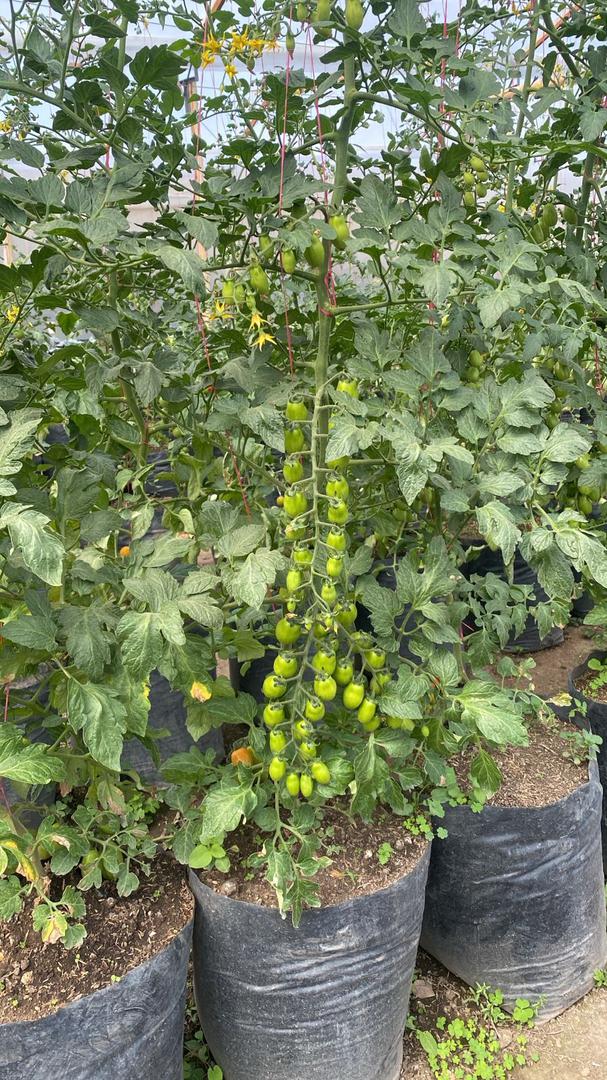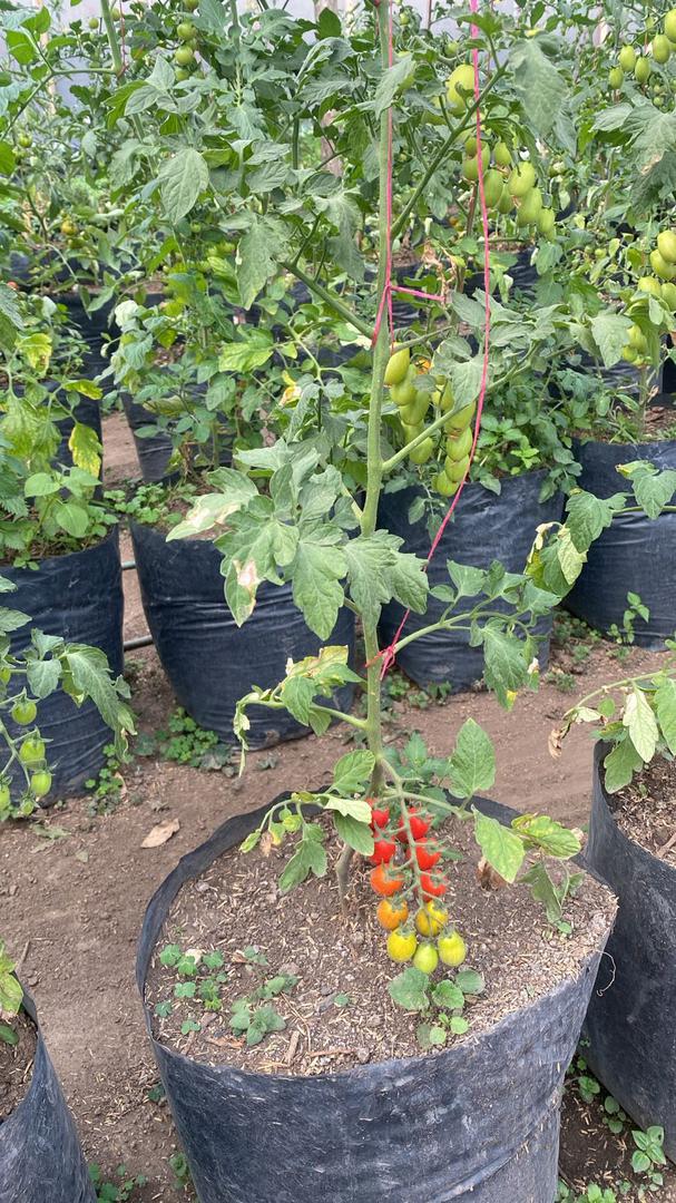 Tomate cherry bajo invernadero cultivado en bolsa, manejo artesanal con productos orgánicos y bajo la norma